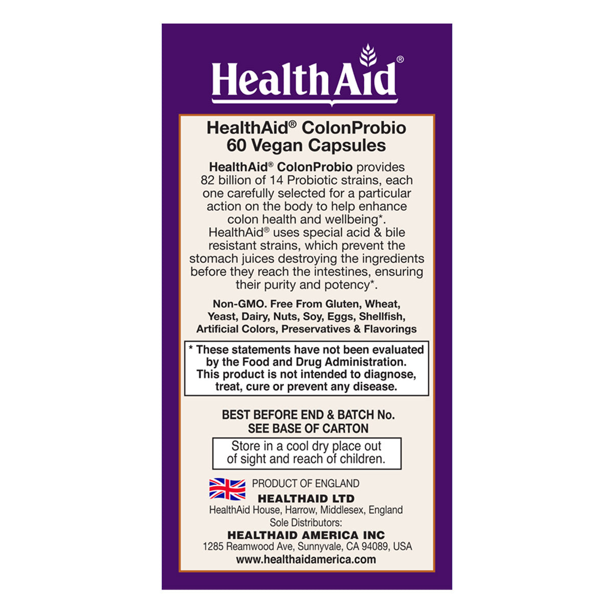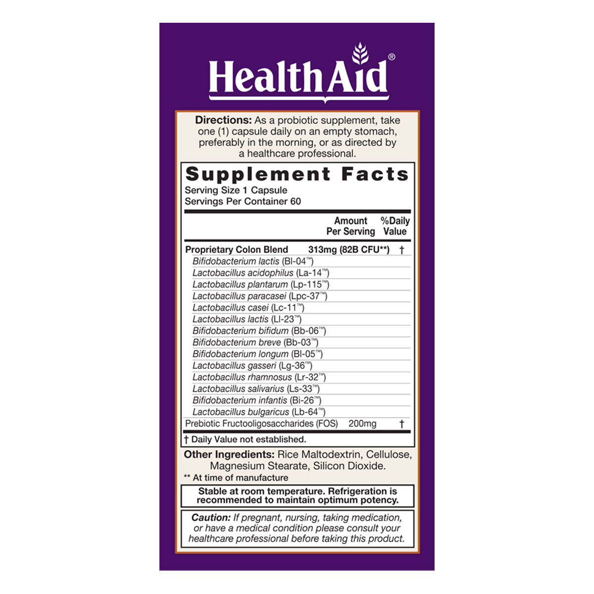 HealthAid® ColonProbio provides 82 billion of 14 Probiotic strains, each one carefully selected for a particular action on the body to help enhance colon health and wellbeing*.