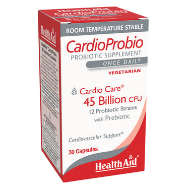 CardioProbio is a unique formulation, containing a superior blend of 45 billion viable bacterial strains intended to support cardiovascular health*. It is fortified with a prebiotic (FOS) for optimum benefit. HeathAid® uses special acid and bile resistant strains, which prevent stomach juices from destroying the ingredients before they reach the intestines, ensuring their purity and potency.