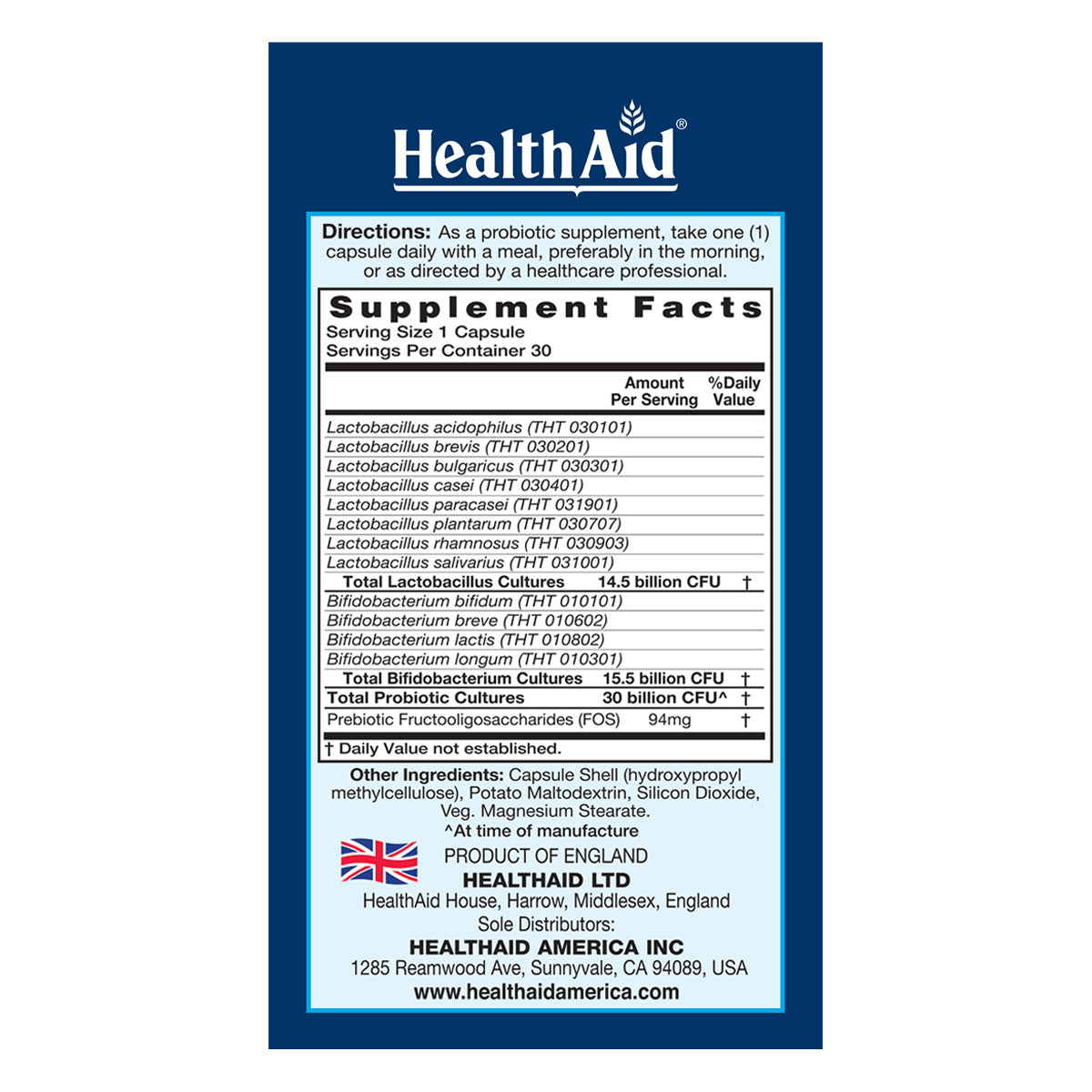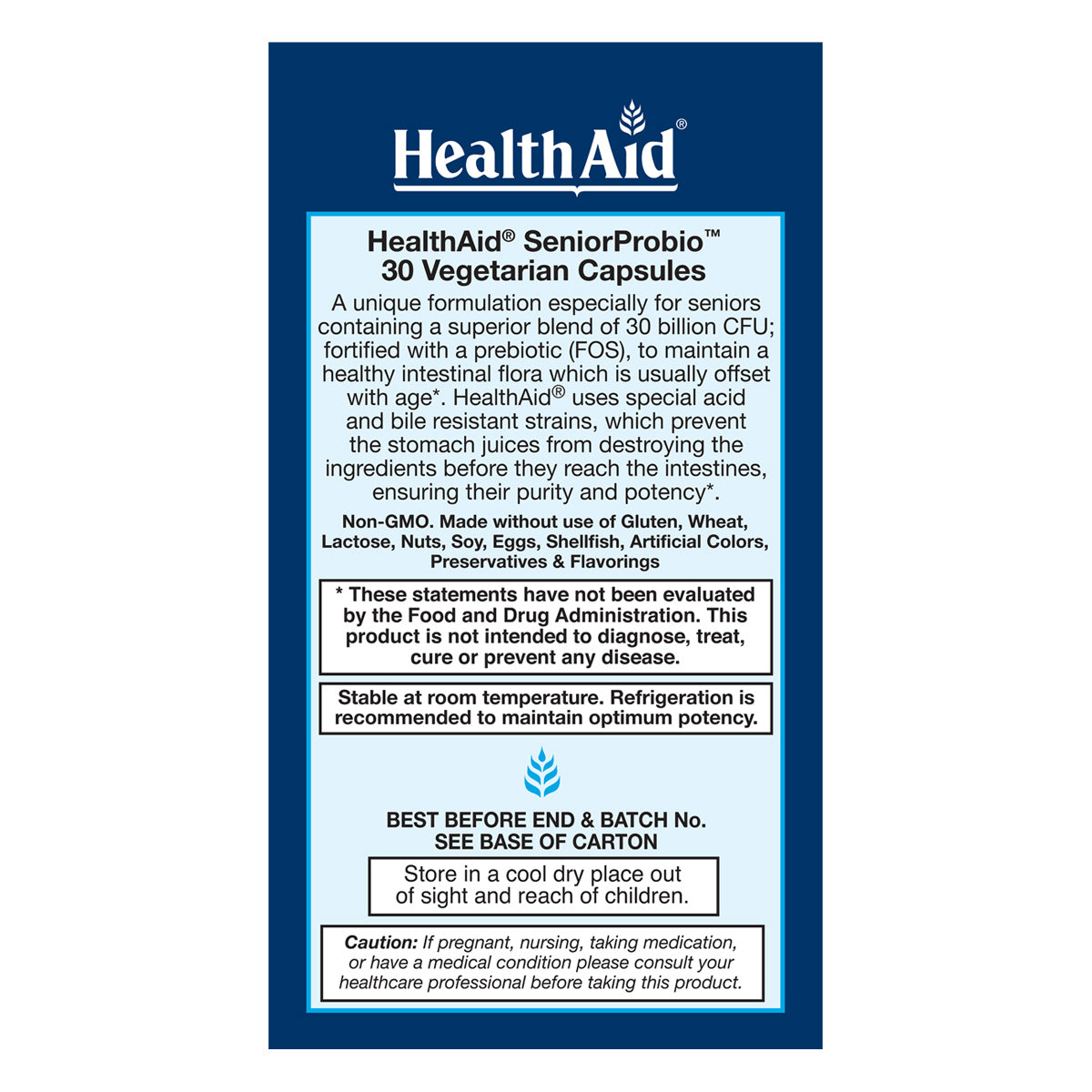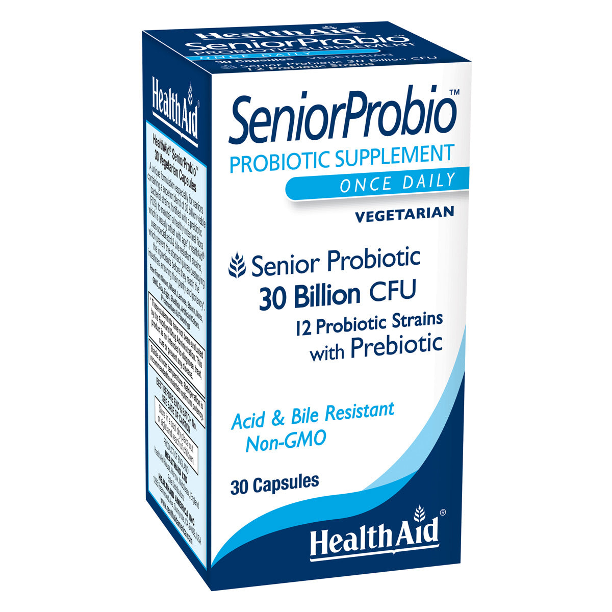 A unique formulation especially for seniors containing a superior blend of 30 billion viable bacterial strains; fortified with a prebiotic (FOS), to maintain a healthy intestinal flora which is usually offset with age*. HealthAid® uses special acid & bile resistant strains, which prevent the stomach juices destroying the ingredients before they reach the intestines, ensuring their purity and potency*.