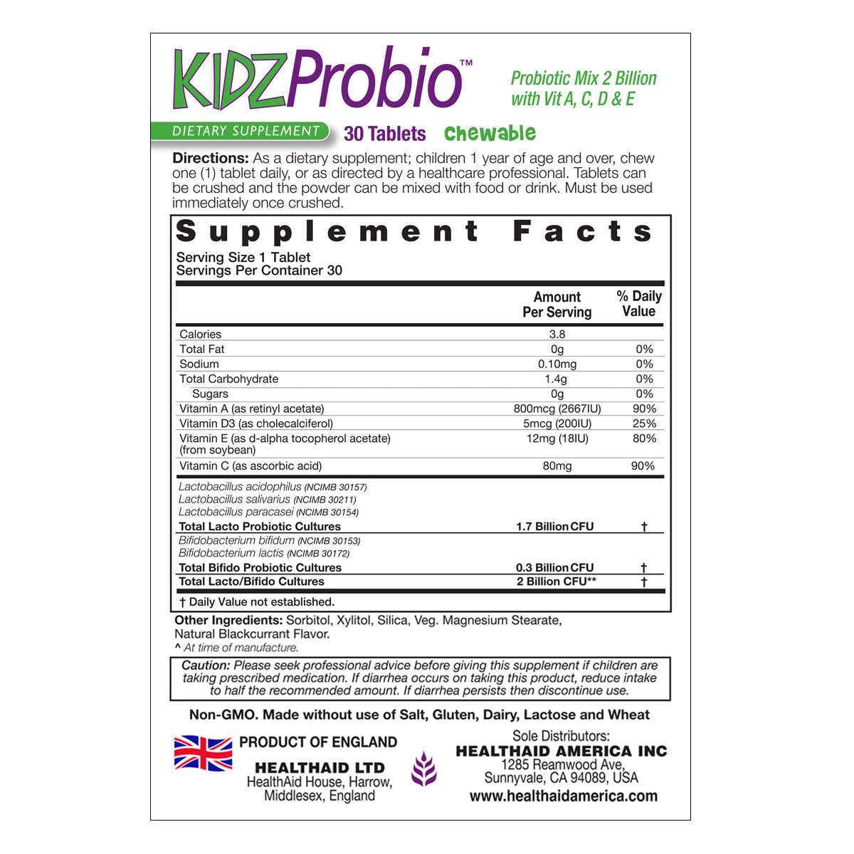 KidzProbio Chewables is a unique formulation containing special viable strains of Lactobacillus and Bifidobacterum designed with your child's wellbeing in mind. Together with the added benefits of Vitamin A, C, D, and E; KidzProbio helps keep the digestive system in balance. HealthAid uses special acid & bile resistent strains, which prevent the stomach juices destroying the ingredients before they reach the intestines, ensuring their purity and potency.