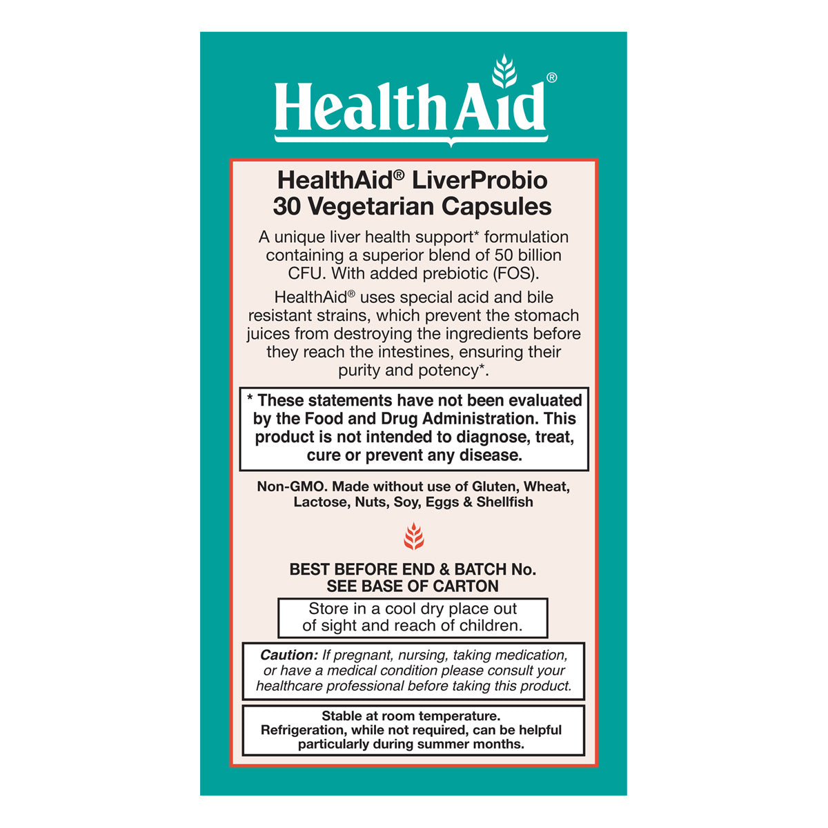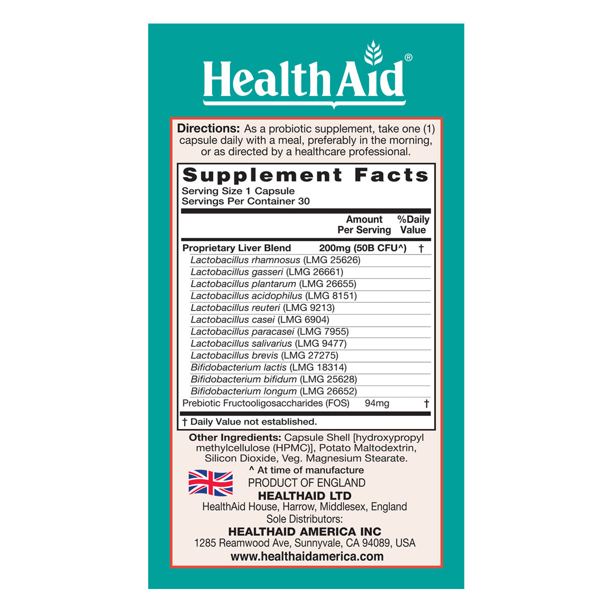 LiverProbio contains a superior blend of 50 billion CFU. With added prebiotic (FOS). HealthAid® uses special acid and bile resistant strains, which prevent the stomach juices from destroying the ingredients before they reach the intestines, ensuring their purity and potency*.