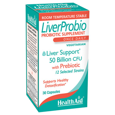 LiverProbio contains a superior blend of 50 billion CFU. With added prebiotic (FOS). HealthAid® uses special acid and bile resistant strains, which prevent the stomach juices from destroying the ingredients before they reach the intestines, ensuring their purity and potency*.