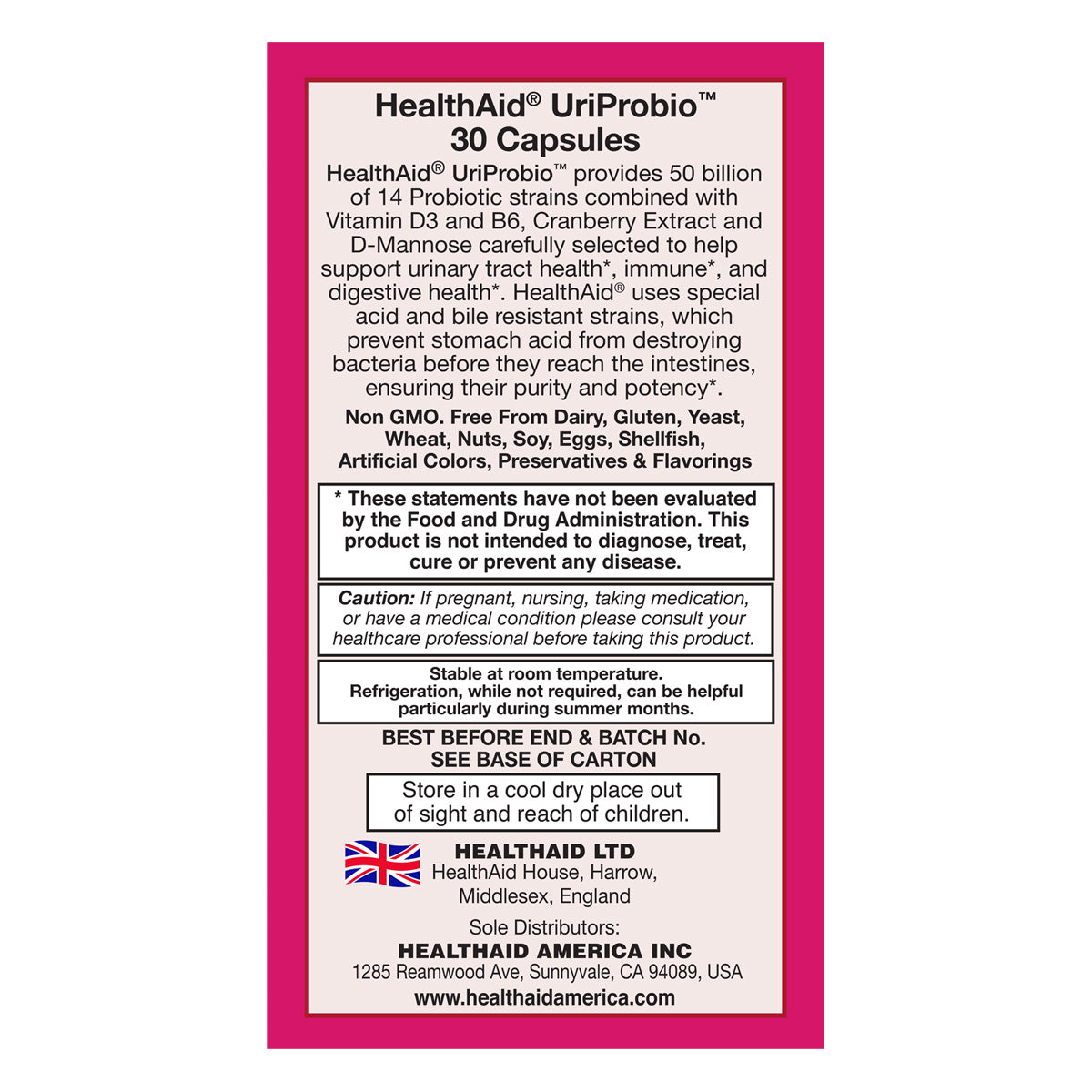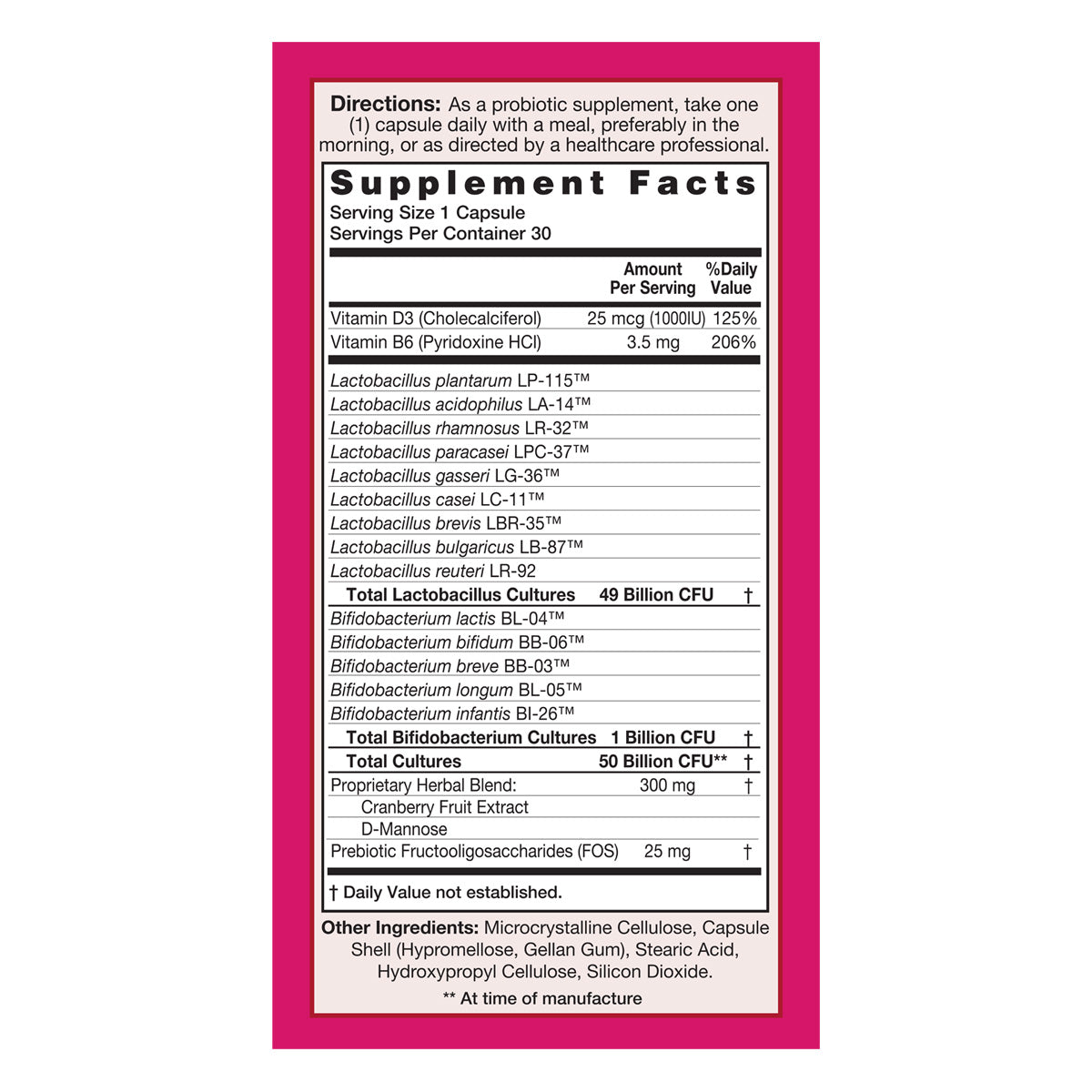 UriProbio™ is a unique formula which supports women’s urinary tract and immune health*. It is also fortified with Vitamin D3 and B6, Cranberry Extract and D-Mannose carefully selected to help support urinary tract health*, immune*, hormonal* and digestive health*.