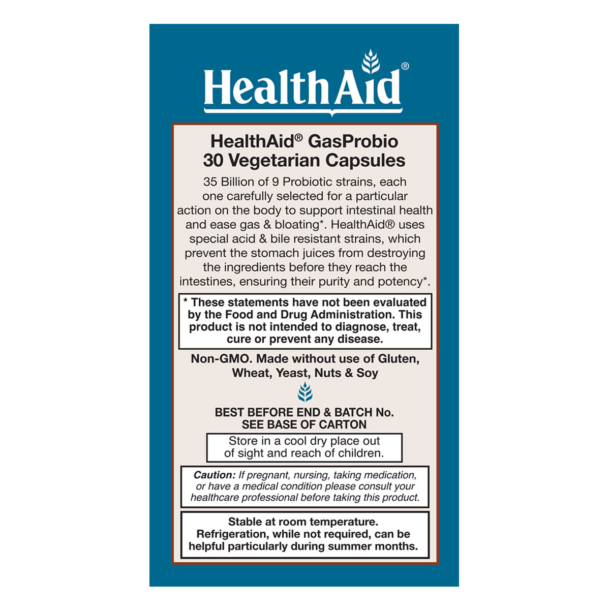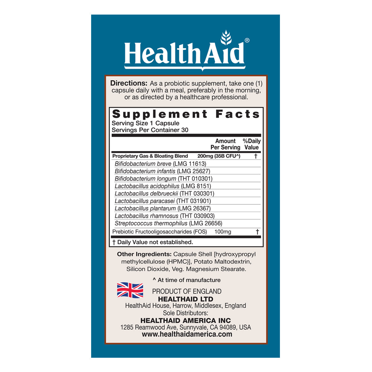 35 Billion of 9 Probiotic strains, each one carefully selected for a particular action on the body to support intestinal health and ease gas & bloating*. HealthAid® uses special acid & bile resistant strains, which prevent the stomach juices from destroying the ingredients before they reach the intestines, ensuring their purity and potency*.