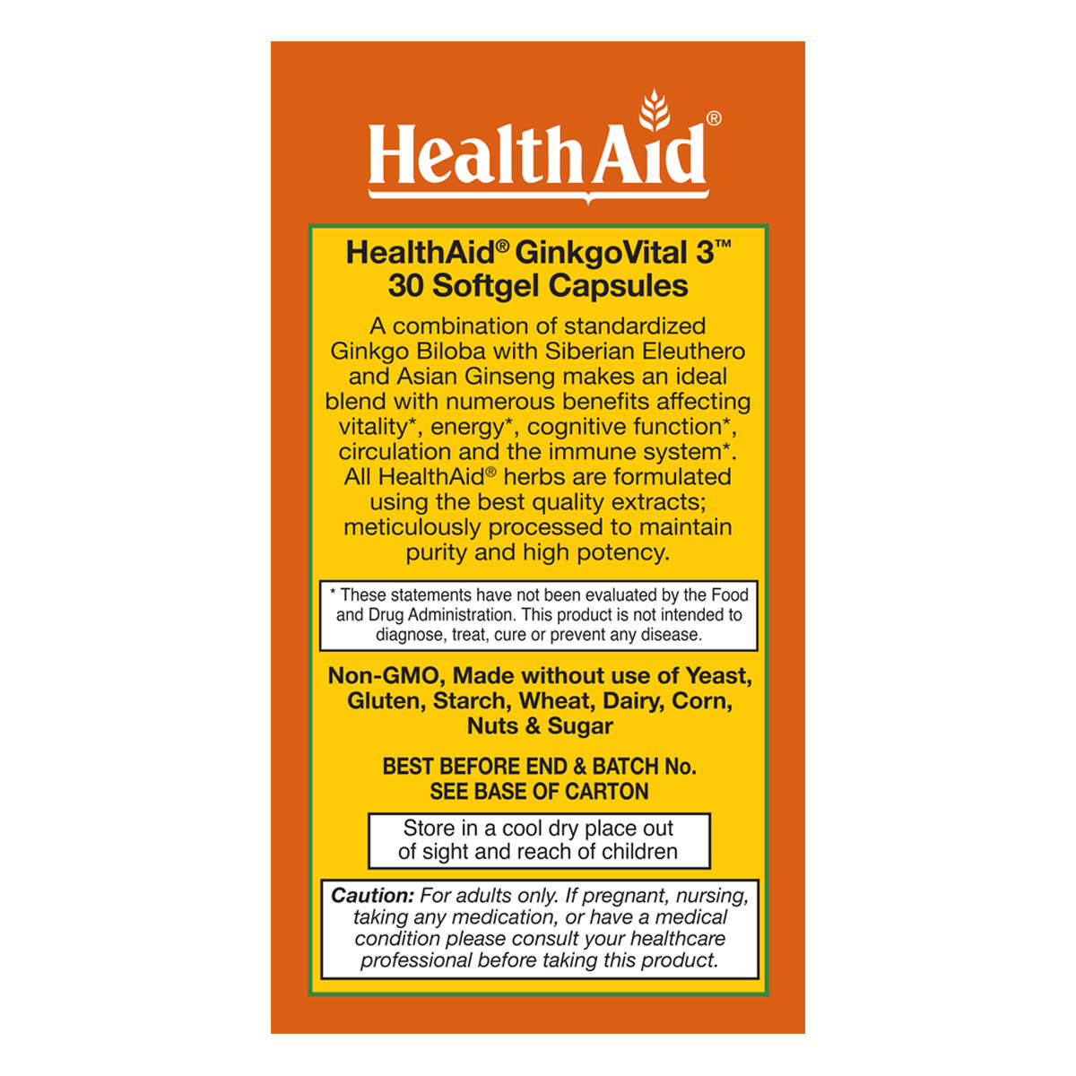 Gingko Vital 3™ combines the benefits of Ginkgo Biloba, Siberian Eleuthero and Asian Ginseng, which work synergistically to increase mental clarity and enhance physical strength and endurance*.